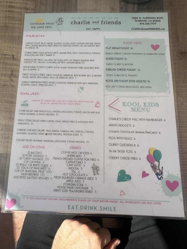 Introducing the menu at Charlie and Friends, a delightful new American breakfast and brunch spot located in Burbank, CA. This women-owned establishment offers a menu that caters to diverse tastes, featuring everything from Breathtaking Buttermilk Pancakes to savory Boss Benedicts. Guests can indulge in creative flight options, such as the Grilled Cheese Flight and Slider Flight, making it perfect for sharing.